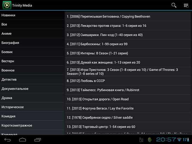 Кроме телевидения плеер предлагает доступ к архиву кино ссылок, содержащем описание фильмов с возможностью их просмотра. Внешний вид каталога с описанием информации по фильмам показан на рисунке.