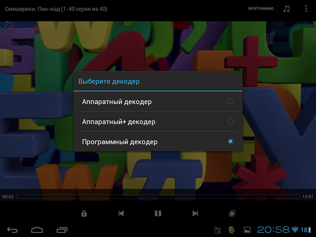 При просмотре фильмов через MX Player нужно отметить такую возможность, как выбор способа декодирования при воспроизведении фильма в программе MX Player (Программный способ декодирования, Аппаратный или Аппаратный+). Наиболее оптимальным вариантом для воспроизведения является способ декодирования, названный в программе как Аппаратный+. Однако он доступен не на всех устройствах. Поэтому оптимальные настройки MX Player вам лучше подобрать опытным путем. Способ "Программный" скорее всего на ваших устройствах будет самым медленным, но одновременно он и самый надежный, позволяющий декодировать и воспроизводить фильмы в любом формате и на любом устройстве. Для переключения способов декодирования нужно при просмотре фильма один раз "тапнуть" в центре экрана, что бы появилось меню, после чего нажать на слово "Программный" в правом верхнем углу, как показано на рисунке. И в появившемся меню выбрать другой способ декодирования видеопотока программой MX Player.